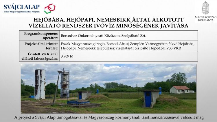Projekt által érintett terület: Az Észak-Magyarországi régióban, Borsod-Abaúj-Zemplén Vármegyében fekvő Hejőbába, Hejőpapi, Nemesbikk települések vízellátását biztosító víziközmű rendszer
